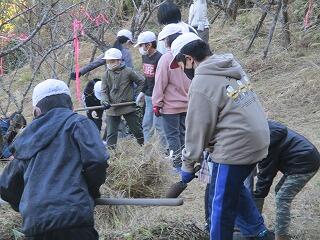 今日、全校で梅の寒肥やりを行いました。梅の木の根元のワラを取り除き、肥料をかけてやりました。グループに分かれ、肥料をあげた木には黄色いスズランテープを付けながら作業しました。