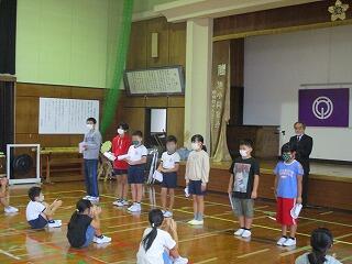 次に、図書担当の東先生から読書の意義に関するお話がありました。それに関連して市読書感想画に応募した7名の表彰がありました。