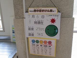 昨日は、昼休みに保健室前の熱中症注意マークが「危険」になりました。外で遊んでいた人たちは教室に上がるよう放送がありました。気温も湿度も高く、外にいるだけで汗が出てきました。日向市では36℃で全国一位の暑さだったようです。今日は、大丈夫なようです。