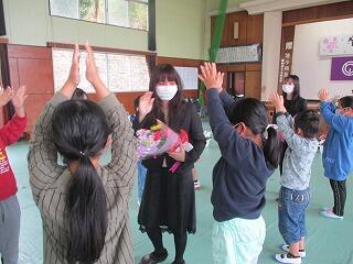 離任式では、退職・転出される先生の紹介後、お一人お一人があいさつを述べられました。児童を代表して卒業生の松本麻央さんがお礼の言葉を述べ、みんなで花束を贈りました。