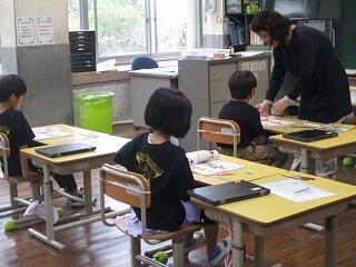 1・2年生の授業です。1・2年学級、3名がそろいました!2名の2年生もうれしそうです。生活科で、さっそく「学校探検」の計画を立てました。なかよくお勉強をしました。