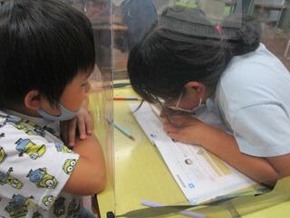 2年生は算数「長さ」で、ものさしを使って㎜を測っていました。パーティションごしに、真剣に相談していました。
