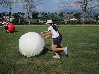 下学年が「大玉転がし」を行うときは、上学年がお父さんお母さんの代わりになって転がすのを手伝ってくれました。
