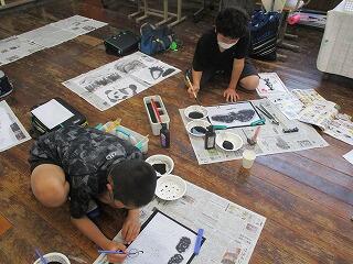 前回、図工で5・6年生は身近な材料を筆に見立てて描く「おもしろ筆」に取り組みましたが、今度は「墨と水から広がる世界」と言う単元で、墨をぼかしながら自由に表現していました。黒一色でも、濃淡でいろいろな表現を楽しんでいました。