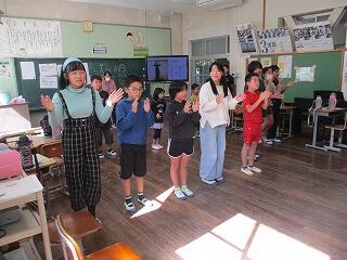 全校児童が、学習発表会で披露するボディーパーカッションの練習をしている様子です。