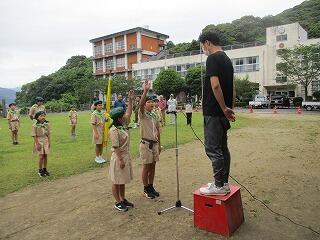 5月26日(日)は、みどりの少年団結団式と奉仕作業がありました。子どもたちは、みどりの少年団の制服を着て、堂々とした態度で入場行進をしたり、ちかいの言葉を述べたりすることができました。保護者の皆さん、地域の方に見守られながら結団式を行うことができました。子どもたちは、声をそろえて「自然を守り育てていくことを誓います」「郷土を愛し、社会のためにつくす心を育てます」など立派にちかいの言葉を述べました。頼もしかったです。