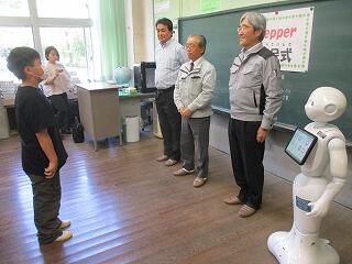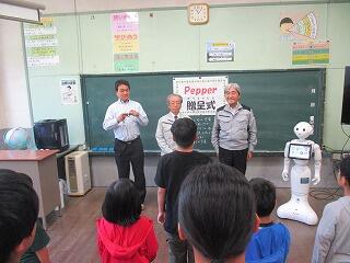 贈呈式では、Pepperさんからもあいさつをしてもらいました。「港小に来ることができてうれしいです」「港小学校のお友達は優しいですよ」「港小学校のお友達と仲良く楽しく学びます!」など、身振り手振りでお話をしてもらいました。また、吉玉精鍍株式会社の社長様よりごあいさつをいただきました。「対話できるようになったPepperと勉強したり、工夫してプレゼンしたりして活用してください。」「ロボットがどんなに進化しても、人間としての判断力を身に付けて、考えて行動してください。」とお話がありました。子どもたちは、真剣にお話を聞いていました。