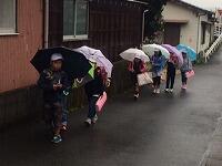 始業の日、あいにくの雨模様となりましたが、27人全員が歩いて元気に登校しました。