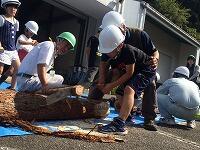 県林業技術センターでは、「プロセッサーの見学と乗車体験」「丸太切り体験」を行いました。