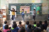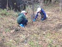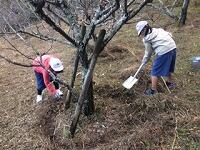 どんぐり班に分かれ、上学年下学年二人組になって、約50本ある梅の木の周りに、肥料をあげました。