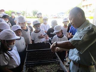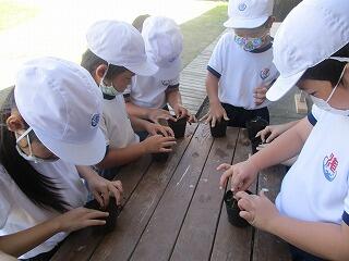 8月27日に、みんなでまいた種が芽を出し、成長してきました。今日の花いっぱい活動は、苗をポットに移し替える作業をしました。1本1本を丁寧に移し替えていきました。