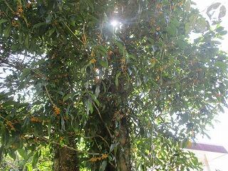 今日は朝、涼しい風が吹き、半袖では肌寒いくらいでした.風に運ばれてうっすらとキンモクセイの香りがしました。玄関先のキンモクセイを見ると花がちょっとだけ咲いていました。裏庭に回ると1本だけあるキンモクセイにたくさんの花が咲いていました。この花の香りが風に運ばれていたようです。先週雨が続いていたので気付きませんでした。同じ敷地内でも開花には大きな開きがあるようです。