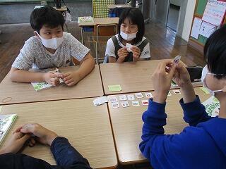 6年生は、外国語科。国旗カードでゲームをしながら、楽しそうに英語で会話をしていました。