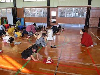 そして放課後子ども教室の茶道教室では、今日は体育館でお茶の礼儀作法を実際にお茶をいただきながら学びました。
