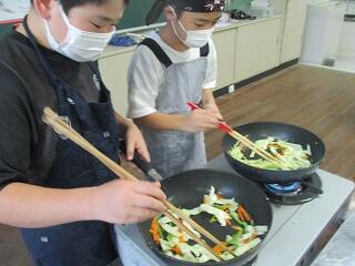 今日は朝から雨が降っています。5・6年生は家庭科で今年初めての調理実習を行いました。6年生の「いためておかずを作ろう」という学習で、野菜を切ったり卵を炒めたりしました。