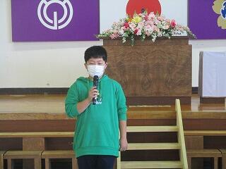 児童代表で、2年の河野夕凪さん、4年の片平青君、5年の岡田竜飛君が作文を発表しました。皆、後期を振り返った長い文章をしっかり発表できました。