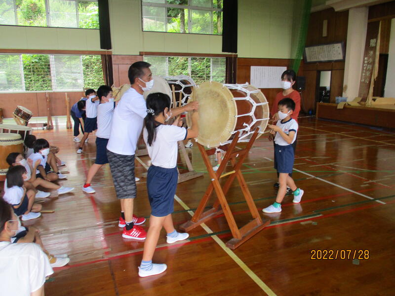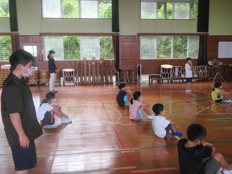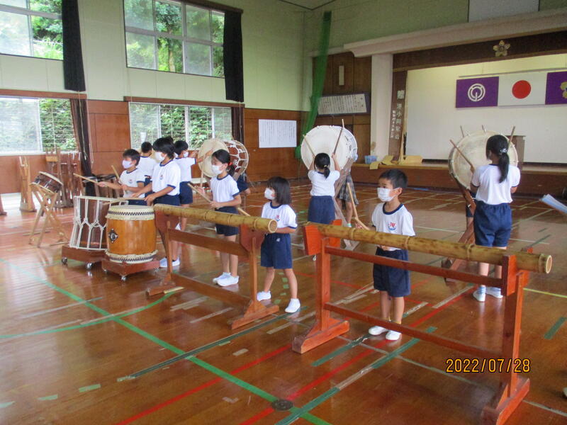 低・中学年の子どもたちも太鼓ことばをずいぶん覚えられるようになってきて、叩くリズムがよくなってきました。高学年になると、足の運びも加わり、迫力が増してきたように思えます。