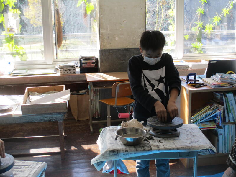 手回しろくろを使って、コップや皿、花瓶など自分の好きなものを作成しました。