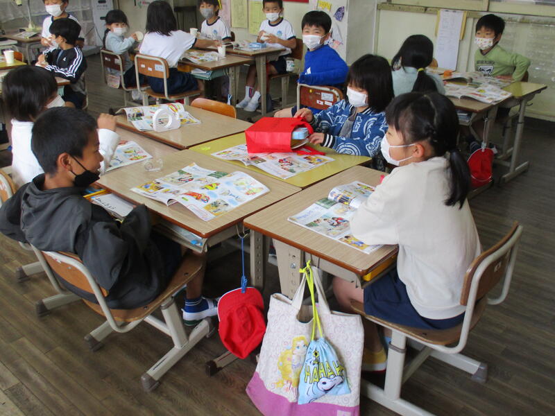 国語の授業では、教科書の絵をもとに物語の構成を考えていく学習を行いました。できあがったものを互いに発表し合い、みんなの考えを知ることができました。