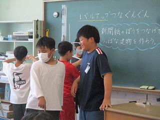 5年生です。5・6年合同の音楽をしたり、図工で新聞紙をつないで建物をつくったり、水泳をしたりしました。