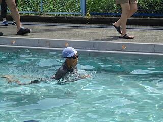 今回は、これまでの練習の成果を発表する記録会を行いました。子どもたちは、それぞれ自分の目標に向けて努力してきました。「いろいろな浮き方ができる」「けのびができる」「バタ足で泳ぐ」「力強くバタ足をする」「クロールの息継ぎができるようになる」「クロールで15m泳ぐ」「クロールで25m泳ぐ」「平泳ぎで50m泳ぐ」等です。記録会では、自分の目標を発表した後、泳ぎました。友達や先生からの応援をもらって、一生懸命泳ぐ姿が見られました。本当に、よくがんばりました。子どもたちの成長ぶりに感動しました!