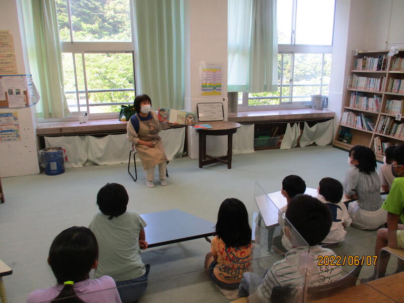 3年ぶりに、読み聞かせボランティアの方による読み聞かせを行いました。ボランティアの喜多俊子さんからはアンパンマン体操や「せんたくかあちゃん」の読み聞かせを、田崎より子さんからは「三匹のぶたの話」「ながーいおはなのブタくん」の読み聞かせをしていただきました。子どもたちも久しぶりの読み聞かせにとてもおもしろかったと笑顔になっていました。学校図書館にはない絵本の読み聞かせだったので、新鮮な気持ちで聞くことができました。