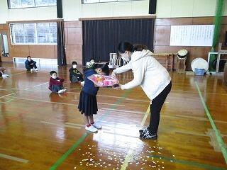 6年生代表・2年生によるお別れの言葉や、全校児童からの手作りの色紙・安産のお守り・人形・くす玉や花束が贈られました。