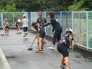 到着すると、まず、自己紹介と浦城小の西山先生からの説明がありました。その後、みんなでプール清掃に取りかかりました。みんな自分の持ち場を綺麗にすることに一生懸命取り組んでいました。作業する中で、お互いの学校同士の交流もできたように思います。浦城小の皆さんもとってもにこやかでした。これから4回ほどプールを使わせていただきます。更に交流できると良いと思います。