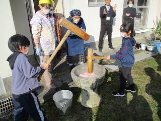 昔の道具を使ってみようということで、餅つき体験をしました。