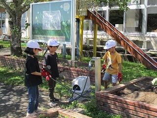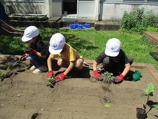 1・2年生の生活科で、野菜を植えました。ナス、オクラ、ピーマン、ミニトマトです。技術員さんに畑の準備をしてもらったり、植え方のこつを教えてもらったりしながら植えることができました。植え終わったら、さっそく水やりです。「大きくなあれ!」と言いながらたっぷり水やりをしました。おいしい野菜ができるのが楽しみです。これからのお世話をがんばってほしいと思います。