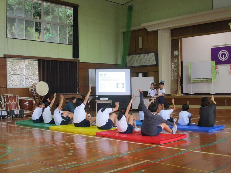 5・6年生は、英語で自己紹介をしました。これまでに学んだ外国語の時間で練習してきたことを発表しました。ジェスチャーを交えながら堂々とスピーチしました。