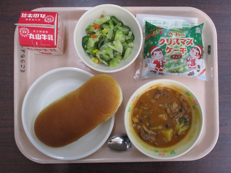 12月22日、今日の給食は『クリスマスメニュー』でした。ビーフシチュー、グリーンサラダ、パン、牛乳、クリスマスケーキでした。一足早いクリスマス気分を味わうことができました。