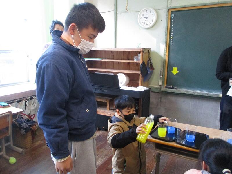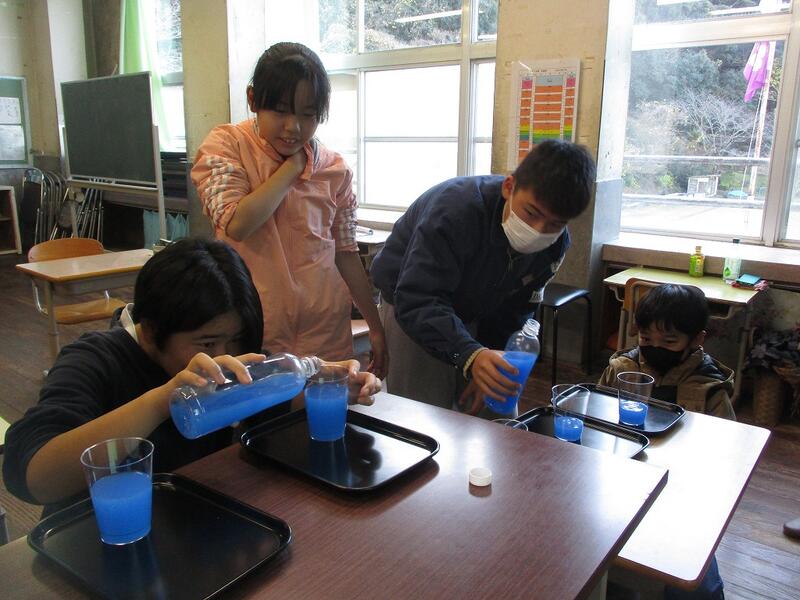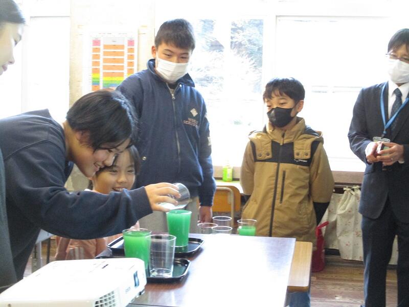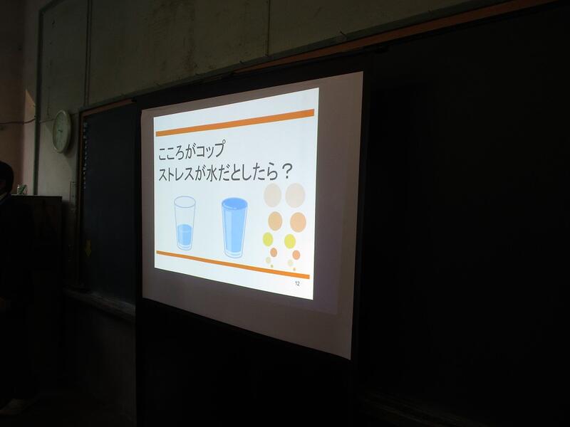 子どもたちは、講師の先生から、こころとストレスの関係について教えていただいたり、こころをコップ、ストレスを水に見立て、こころの状態について体験したりしました。また、ストレスの対処方法の一つである「深呼吸」を実際に体験しました。