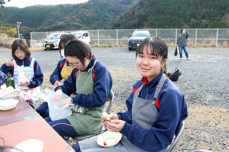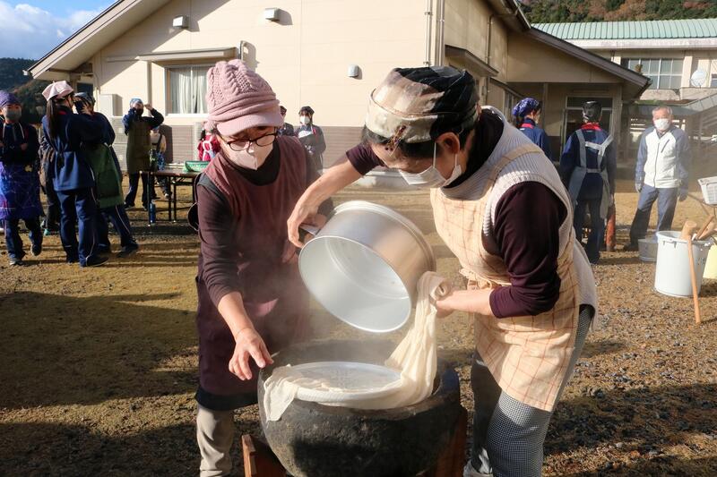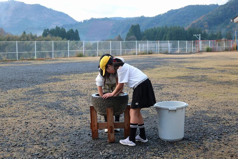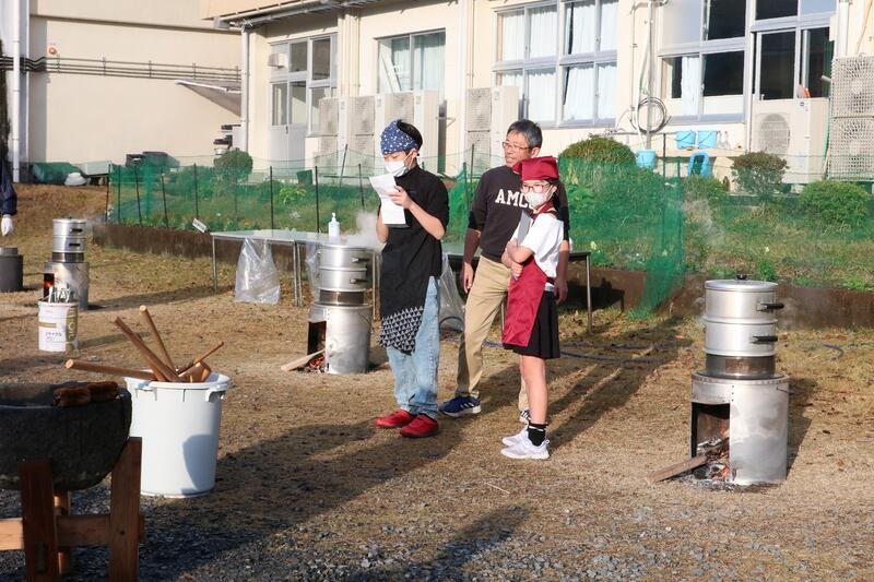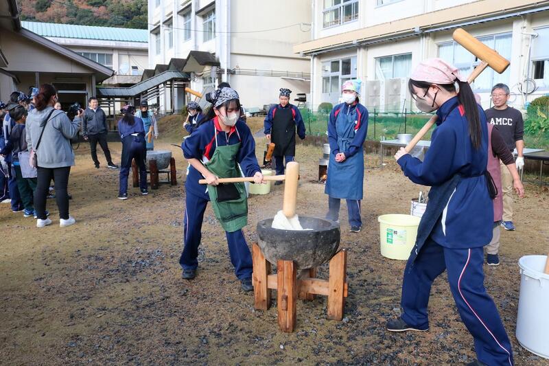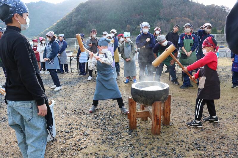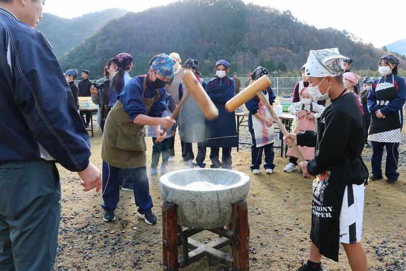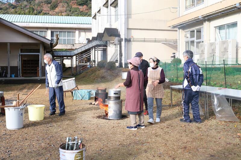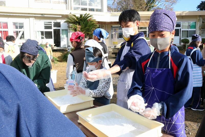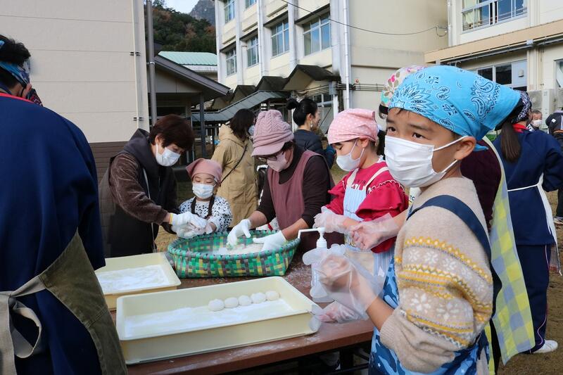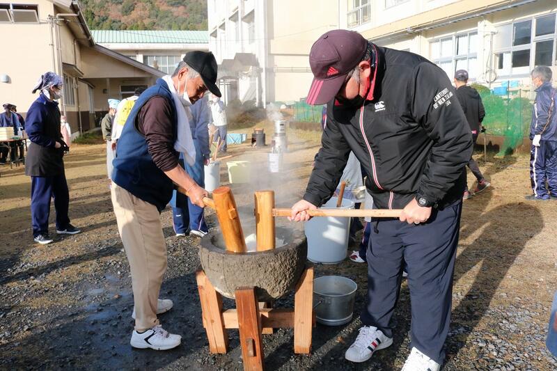 12月14日(日)は天気にも恵まれ、予定通りふれあい餅つき+PTAバザーを実施しました。朝早くから火をおこし、小中学生力を合わせて準備をしました。地域の方と一緒に餅つきが出来るのも黒岩ならではだと思います。ついたお餅を丸め、地域の方にもお配りし、自分たちも醤油やのりをつけて食べました。その後受験する中学3年生にエールも送ることが出来ました。