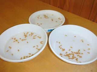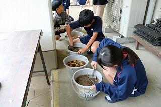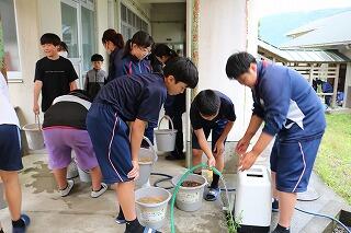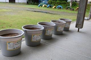 5月30日(金)に全校児童生徒で、バケツ苗(米作り)に挑戦しました。これは、バケツに土、肥料、水を入れ、かき混ぜた後に種籾を入れ、水が涸れないように世話・観察します。しばらくすると草取りも必要でしょうね。今年は、田植えがないためそれに代わるものとして、JAにバケツ苗セットの希望を出したところ全校児童生徒に行き渡る量をいただきました。バケツは買いました。誰のものか分かるシールも貼っています。早くも苗がひょろひょろと出てきています。