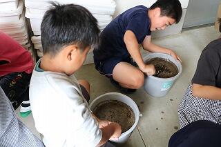 | 小学生をリードする玖音さん | みんなで協力します | すり鉢でゴリゴリ | まだ全部脱穀できな~い |