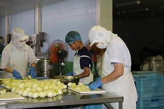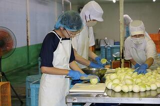 2月20日(木)3校時より小学部では、とんとん教室を開きました。とんとん=音=木工?と思うかもしれませんが、とんとん=豚ということで、豚肉を使った餃子作りに挑戦しました。宮崎市内からみやざきハマユウポークの方が2名来られ、必要な材料も持ってきていただいたので、講義を聴いた後、早速調理に取りかかりました。みんな楽しそうに調理をしていました。1年生も苦労しながら、餃子の型に上手にはめていました。焼き上がりをお裾分けしてもらいましたが、とてもおいしかったです。その後の給食もみんな完食していたのはびっくりでしたが・・・