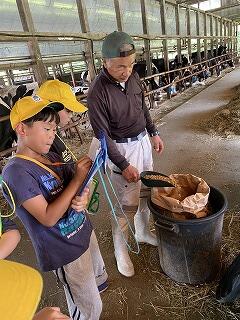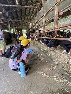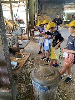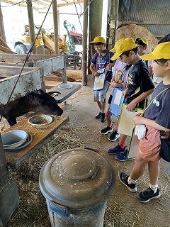 7月1日(火)9時過ぎに学校を出発して、大野にある牛農家松田さん宅を訪問しました。事前に児童は質問を考え、積極的に質問していたようです。間近で大きな牛を見た児童は、とてもびっくりしていました。このような機会は、4年生が1年生の時にもあったようで、そのときは、牛が怖くて泣いてしまい、牛小屋に入れなかった児童もいたようです。今回は堂々と入れました。松田さんもそのときのことを覚えていらっしゃいました。
