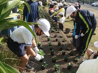 本校では、「ふれあい花壇活動」として、地域の方々とともに花の栽培活動を行っています。昨年、今年とコロナ禍の影響で、残念ながら地域の方々と一緒に活動することはできていません。今回は、来春用の花の栽培をしました。卒業式、入学式に向けて、きれいな花を咲かせ作れるといいなと思います。