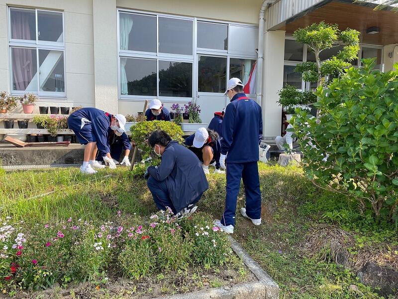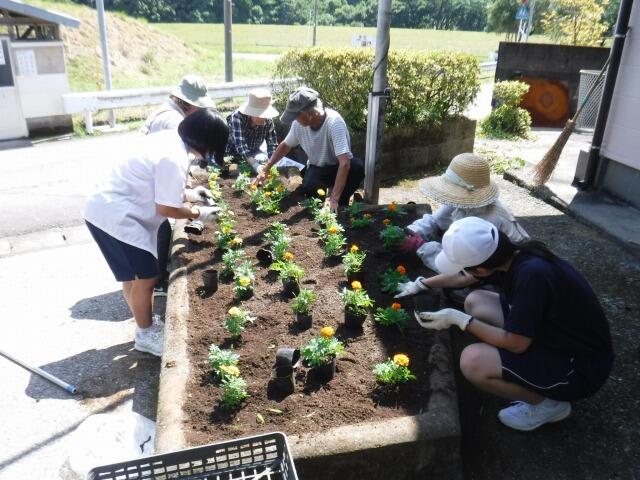 6月22日に、中学生が手分けして、校区内各地区の「ふれあい花壇」に花の苗を植えました。