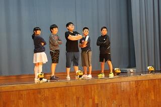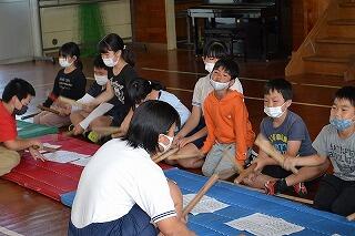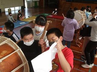 そこで、中学生数名が小学生(3~6年生)にも太鼓を教えてくれることになりました。はじめは全然たたき方が分からなかった子どもたちも、2時間の練習でかなりたたけるようになってきました。本番もたたきたいという子どもたちも出てきました。