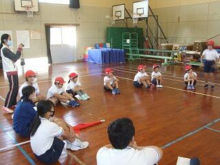 赤・白決定は、チーム対抗のフラフープくぐりをしました。早速、チームの団結力が試されました。そのゲームの結果、A団が赤団、B団が白団となりました。