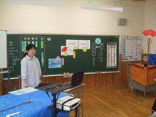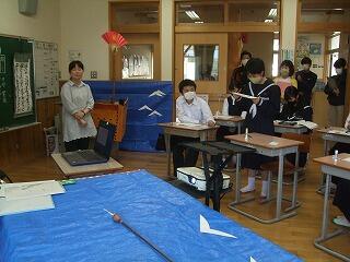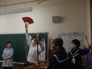 研究授業は、2年生の国語科で「平家物語」の学習でした。授業は、「平家物語」で有名な弓の名手「那須与一」が船に掲げられた扇を射抜く場面を、場面の様子や人物の気持ちがわかるように、工夫して読む学習でした。