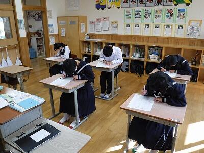 低学年は鉛筆で、3年生以上は毛筆で行いました。3年生以上は、自分で考えたり、選んだりした四字熟語などを書きました。子どもたちそれぞれに、味のある字を書いていて、一人一人の思いがこもった作品ができていました。