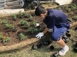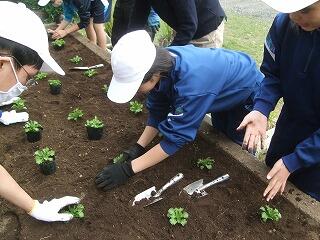 中学部は、校内の花壇と各地区にある花壇に花の苗を植えました。