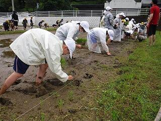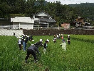 夏休みの登校日に予定していた草取りができなかったため、2学期が始まってすぐに草取りをしました。初めての経験の子どもたちも多く、ぬかるんだ田んぼの土と稲と草に悪戦苦闘のようでした。(小学部のみで実施)