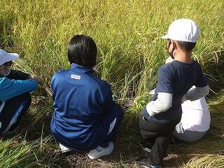 6月に田植えをしたもち米の稲刈りをしました。初めて稲刈りをする子どもたちもいましたが、中学生や上学年の子どもたちが優しく教えてくれていました。もち米は、たくさん収穫ができました。次はもちつきです。楽しみです。