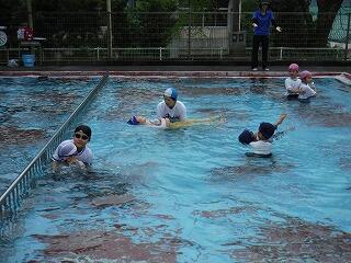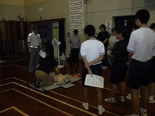 消防署署員の皆様に来ていただき実施しました。今回は中学生も参加しました。水の事故に備えるだけでなく、近年の猛暑による熱中症の対応についても学びました。命を守る知識として覚えていてほしいです。参加していただいた保護者の皆様方もありがとうございました。