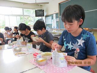 今日の給食には、ガスや電気、水道が止まった時にも食べられる「救給カレー」が出ました。9月1日が「防災の日」です。また、地震や水害などの大規模災害も毎年のように起こっています。そのような災害時に「食」について考えてほしいという目的で出されました。