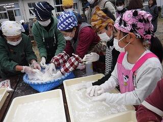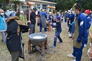 7日(土)に保護者・地域の皆様にご協力いただき実施しました。この日使用したもち米は、児童・生徒が、田植えから稲刈りをして収穫したものです。今ではする機会の少なくなった、臼と杵を使った「もちつき」の体験をみんな楽しんでいました。後日、食べた感想を聞くと「とてもやわらかくておいしかったです。」という声が多く聞かれました。杵と臼を使って自分たちで作ったお餅の味は格別だったようです。